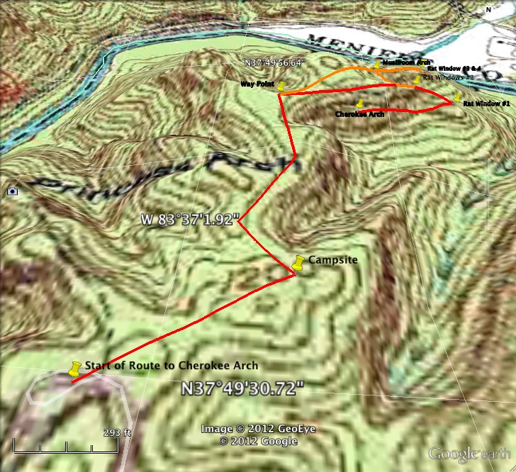 GPS Coordinates of start of hike to Cherokee Arch 37, 49′ 30.26 N 83, 37′ 04.78 W GPS Coordinates of campsite 37, 49′ 34.87 N 83, 36′ 56.12 W GPS Coordinates of waypoint #1 37, 49′ 37 N 83, 36′ 59 W GPS Coordinates of waypoint #2 37, 49′ 48.3 N 83, 36′ 57.47 W GPS Coordinates of Rat Windows #2 37, 49′ 51.6 N 83, 36′ 47.4 W GPS Coordinates of Rat Windows #1 37, 49′ 50.8 N 83, 36′ 43.3 W GPS Coordinates of Cherokee Arch 37, 49′ 47.8 N 83, 36′ 52.3 W GPS Coordinates of Mushroom Arch 37, 49′ 53.1 N 83, 36′ 49.6 W GPS Coordinates of Rat Windows #3 & #4 37, 49′ 54.3 N 83, 36′ 47.5 W
