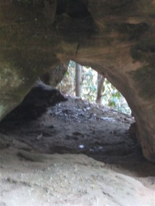 - Turn left on trail #100 Sheltowee Trace Trail (1.0 miles)- Pass Indian Arch after 100 yards, and KY 80 Arch at the end of the rock shelter below Indian Arch after another 100 yards. KY 80 Arch is unmarked and you will need to get off the trail and below the rock shelter to find it.