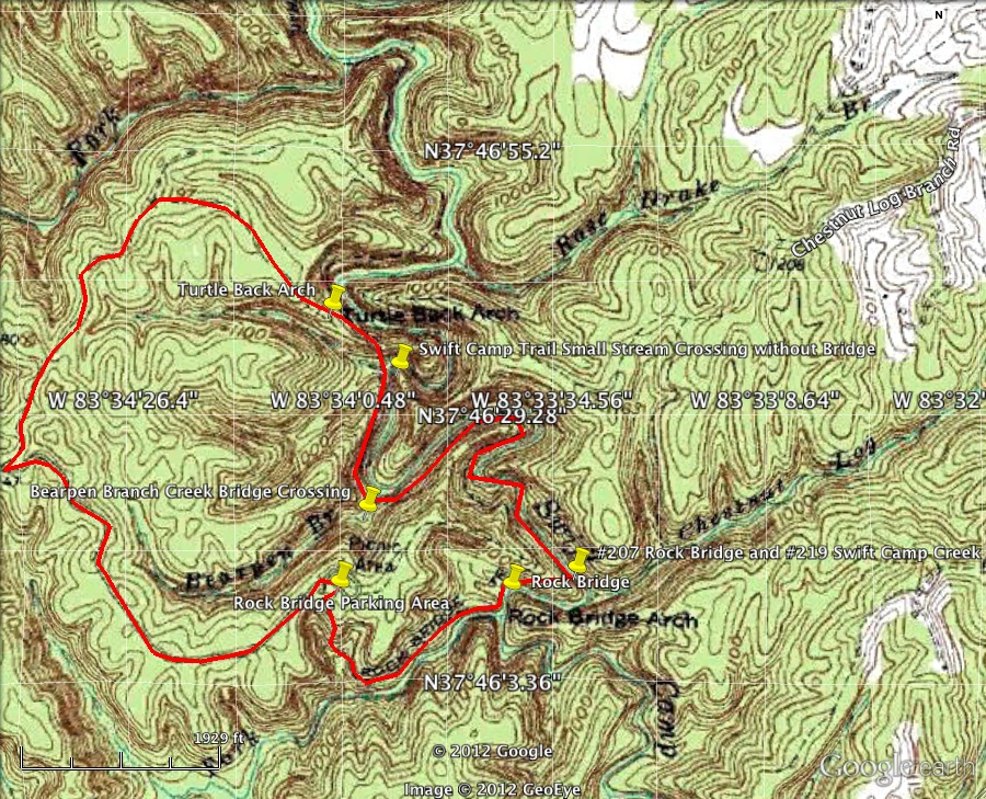 - Continue on trail #207 Rock Bridge Trail until you arrive at Junction for trail #219 Swift Camp Creek Trail. (0.2 miles)